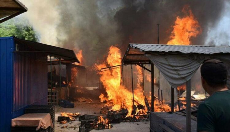 Φωτογραφίες που έδωσε στη δημοσιότητα το πρακτορείο του Ντονέτσκ δείχνουν την κεντρική αγορά Μαϊσκι να έχει τυλιχθεί στις φλόγες και τουλάχιστον ένα πτώμα.
