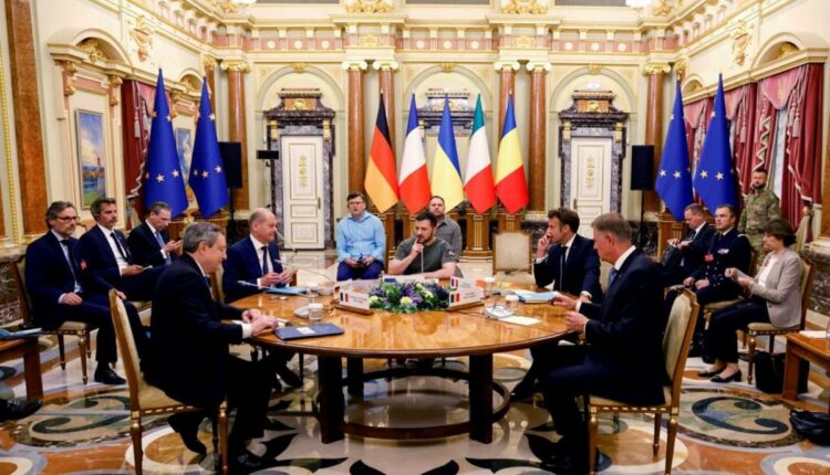 Οι Ντράγκι, Μακρόν, Σολτς και Γιοχάνις έφθασαν στη συνέχεια στο Μέγαρο Μαριίνσκι, στο κέντρο του Κιέβου, όπου τους υποδέχθηκε ο Βολοντίμιρ Ζελένσκι.