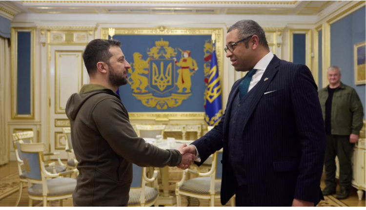 Ο Βρετανός υπουργός Εξωτερικών Τζέιμς Κλέβερλι επισκέφθηκε σήμερα την Ουκρανία όπου συνάντησε τον πρόεδρο Βολοντίμιρ Ζελένσκι και ανακοίνωσε νέα βοήθεια προς τους Ουκρανούς «στον αγώνα τους».