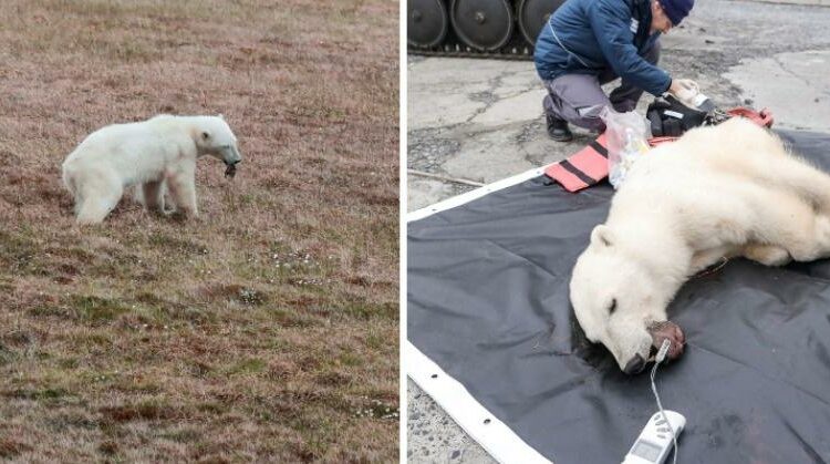 The emaciated polar bear – turned out to be a female – was rescued, vets successfully freed her tongue & treated multiple cuts. The bear is over a year old and weighs only 90kg; the team will leave several bags of fish by her side, and will monitor her well-being for several days pic.twitter.com/KnO91WHBDS