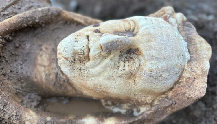 Η ανακάλυψη έγινε – με το πρόσωπο να αναδύεται πρώτο – καθώς μια μπουλντόζα έσκαβε ανάμεσα σε παλιές σωληνώσεις που έπρεπε να αντικατασταθούν. Αμέσως επενέβη η αρχαιολόγος που επέβλεπε τις εργασίες.