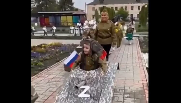 Ανάμεσα τους ξεχωρίζει και ένα αγοράκι, το οποίο, μάλιστα ηγείται της πομπής και το οποίο είναι ντυμένο σαν ρωσικό τανκ με ένα λευκό σύμβολο «Ζ» στο μπροστινό μέρος – ένα κοινό χαρακτηριστικό των στρατιωτικών οχημάτων της Μόσχας που συμμετέχουν στον πολέμο στην Ουκρανία.