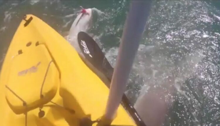 Ο ψαράς που προσπαθεί να ανεβάσει στο καγιάκ το κοκινόψαρο των 45 κιλών μόλις που θα γλυτώσει από τα σαγόνια του καρχαρία. Το κήτος παραλίγο να τον δαγκώσει στο πόδι.