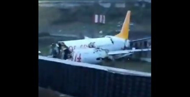 Στις εικόνες που μεταδίδουν τουρκικά τηλεοπτικά δίκτυα από το σημείο, διακρίνεται η άτρακτος του αεροσκάφους να έχει κοπεί στη μέση και ορισμένοι επιβάτες να απομακρύνονται από αυτό.