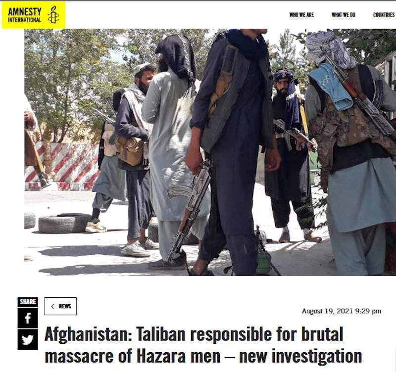 Η Διεθνής Αμνηστία αποκάλυψε ότι τον περασμένο μήνα, όταν οι Ταλιμπάν πήραν στα χέρια τους τον έλεγχο της επαρχίας Γκάζνι, μαχητές τους μακέλεψαν εννέα μέλη της μειονότητας Χαζάρα, της τρίτης μεγαλύτερης στο Αφγανιστάν (απότελούν το 9% των περίπου 40 εκατ. κατοίκων) , που ασπάζεται κυρίως το σιιτικό Ισλάμ, είναι μογγολικής και κεντροασιατικής καταγωγής και έχουν υποστεί σφοδρές διώξεις στο παρελθόν από τους σουνίτες Ταλμπάν. Οι μαρτυρίες αυτοπτών μαρτύρων, που συνέλεξε η οργάνωση για τους φόνους στο χωριό Μουνταράχτ στο διάστημα μεταξύ 4 και 6 Ιουλίου είναι συγκλονιστικές. Τα έξι από τα θύματα πυροβολήθηκαν και τα άλλα τρία βασανίστηκαν μέχρι που ξεψύχησαν, ανάμεσά τους κι ένας άνδρας που τον στραγγάλισαν με το μαντήλι του και του έκοψαν τους μυς των χεριών του.