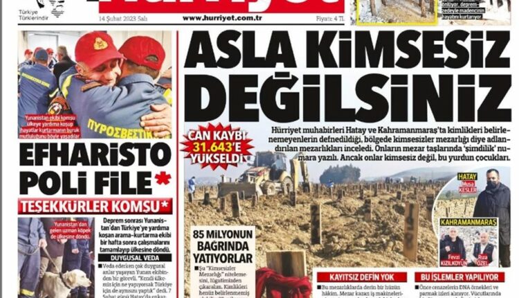 Την ευγνωμοσύνη του τούρκικου λαού για τη συμπαράσταση των Ελλήνων εκφράζει μέσα από το πρωτοσέλιδό της η εφημερίδα Hurriyet.