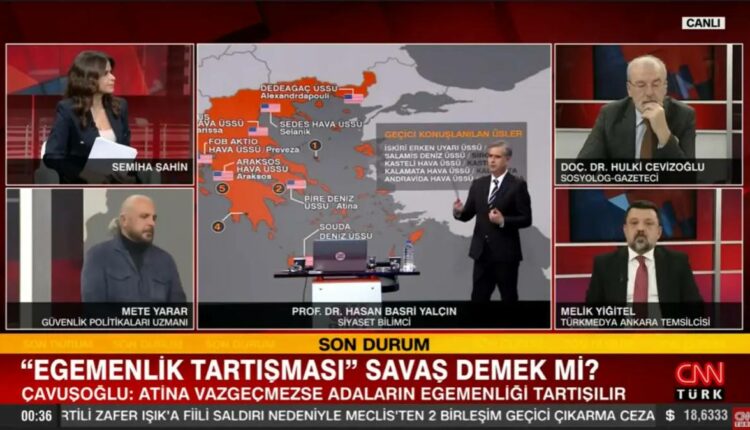 Σε εκπομπή του CNN Turk ο αναλυτής Χασάν Γιαλτσίν σχολίασε, απαντώντας σ’ ερώτηση «εάν η αμφισβήτηση της κυριαρχίας τω νησιών σημαίνει πόλεμο και αν υπάρχει αιτία πολέμου», πως οι πρόσφατες στρατιωτικές ασκήσεις της Αθήνας σε Ρόδος και Λέσβο «αποτελούν ένα βήμα πριν από τον πόλεμο» επαναλαμβάνοντας το τουρκικό αφήγημα για τα νησιά. «Η άσκηση που πραγματοποίησε η Ελλάδα στη Λέσβο είναι ένα βήμα πριν απο τον πόλεμο. O πολιτικός στόχος της Τουρκίας είναι η αποστρατιωτικοποίηση αυτών των νησιών. Οχι μόνο να μην κάνετε στρατιωτικές ασκήσεις, δεν πρέπει να υπάρχουν καθόλου όπλα. Οι Συνθήκες αυτό λένε» σχολίασε ο Γιαλτσίν, τονίζοντας πως η Άγκυρα : «δεν έχει άλλες επιλογές».