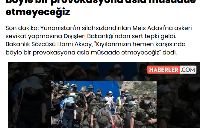 Σύμφωνα με το haberler.com «Η Ελλάδα αποβίβασε στρατό στο Καστελόριζο, μόλις 2 χλμ από την Τουρκία» και δημοσιοποιεί φωτογραφίες του Γαλλικού Πρακτορείου Ειδήσεων (AFP) που δείχνουν Έλληνες στρατιωτικούς ν’ αποβιβάζονται μαζί με τουρίστες στο νησί.