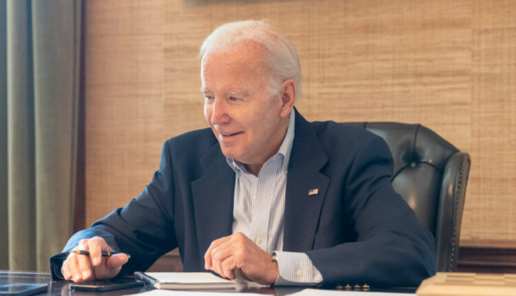 Στη φωτογραφία, εικονίζεται ένας χαμογελαστός Μπάιντεν, με κοστούμι και πουκάμισο, αλλά χωρίς γραβάτα, σε ένα γραφείο του Λευκού Οίκου.