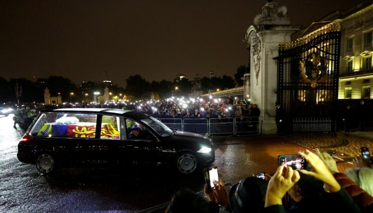 Στις 21:10, η νεκροφόρα ξεκίνησε τη σύντομη διαδρομή της για το Μπάκιγχαμ. Σε μία πένθιμη πορεία στο βροχερό Λονδίνο, οι δρόμοι ήταν κλειστοί και του οχήματος προπορεύονταν τρεις άνδρες της Τροχαίας, πάνω στις μηχανές τους. Πολλοί Λονδρέζοι, αλλά και τουρίστες, κατέγραφαν τις ιστορικές στιγμές με τα κινητά τους τηλέφωνα, καθώς η αυτοκινητοπομπή πλησίαζε τα ανάκτορα.
