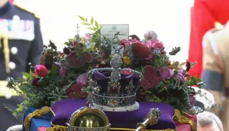 Με ένα πλούσιο στεφάνι από λουλούδια, την κορώνα της και τη σημαία του οίκου των Ουίνσδορ, το φέρετρο της βασίλισσας Ελισάβετ είχε και ένα προσωπικό μήνυμα του βασιλιά Καρόλου, του γιου της, ο οποίος το ακολούθησε συντετριμμένος μαζί με τα υπόλοιπα μέλη της βασιλικής οικογένειας.