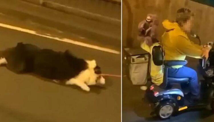 Στο εν λόγω κλιπ, το οποίο τράβηξε ένας άνδρας από όχημα που κινείτο κοντά στο scooter, το ασπρόμαυρο σκυλί εμφανίζεται να είναι δεμένο με λουρί στο πίσω μέρος του αμαξιδίου, ενώ η οδηγός του δεν προσέχει καν ότι ουσιαστικά σέρνει το ζώο στον δρόμο.