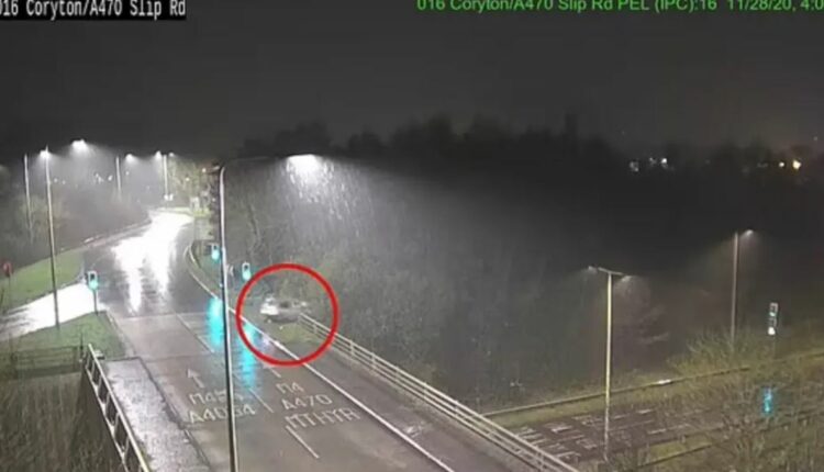Η κάμερα που βρίσκεται στην άκρη του δρόμου δείχνει ένα VW Golf με οδηγό τον 35χρονο Andrew Vowles να σπάει τα προστατευτικά κιγκλιδώματα και να πέφτει από ύψος 22 ποδιών από έναν δρόμο στη νότια Ουαλία τον Νοέμβριο του 2020.