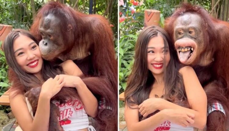 Στο βίντεο που δημοσιεύει η Daily Mail ο ασυγκράτητος ουρακοτάγκος εμφανίζεται να αγκαλιάζει την 27χρονη Έιντζελ Όραντζλορ και μετά να βάζει τα χέρια του στο στήθος της, να την τραβάει επάνω του και να της δίνει ένα φιλί στο μάγουλο. Στη συνέχεια, χαμογελάει πλατιά ποζάροντας για τις κάμερες των φίλων της «καλής» του…