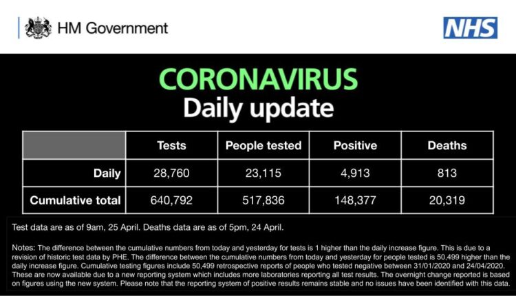 Ο απολογισμός των νεκρών από τον νέο κορωνοϊό στα νοσοκομεία σε όλο το Ηνωμένο Βασίλειο αυξήθηκε σε 20.319, καταγράφοντας αύξηση κατά 813 μέσα σε 24 ώρες, όπως έδειξαν τα τελευταία στοιχεία που ανακοινώθηκαν από το βρετανικό υπουργείο Υγείας.
