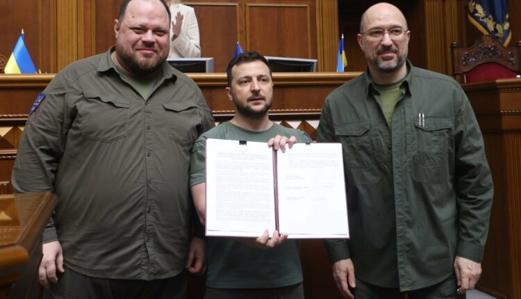 Ο Ζελένσκι, ο πρωθυπουργός Ντένις Σμιγκάλ και ο πρόεδρος του κοινοβουλίου Ρουσλάν Στεφαντσούκ υπέγραψαν μια κοινή δέσμευση συμβολίζοντας την ενότητα των τριών κλάδων της εξουσίας στις προσπάθειές τους για ένταξη στην ΕΕ