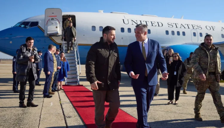 Ο Ουκρανός πρόεδρος έφτασε στη βάση Joint Base Andrews, έξω από την Ουάσιγκτον, με αεροσκάφος της US Air Force, χωρίς να έχει γίνει γνωστό από πού τον παρέλαβε.