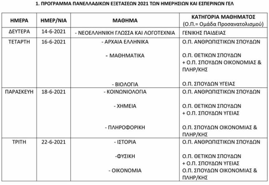 Ανακοινώθηκε από το Υπουργείο Παιδείας και Θρησκευμάτων το πρόγραμμα των πανελλαδικών εξετάσεων Γενικών Λυκείων και Επαγγελματικών Λυκείων 2021, όπως αυτό καθορίστηκε με σχετικές Υπουργικές Αποφάσεις. Οι εξετάσεις ξεκινούν στις 14 Ιουνίου, με το μάθημα της Νεοελληνικής Γλώσσας και Λογοτεχνίας για τους μαθητές όλων των ομάδων προσανατολισμού και ολοκληρώνονται για τα γενικά λύκεια στις 22 Ιουνίου. Στις 15 Ιουνίου στη μάχη για μια θέση στην τριτοβάθμια εκπαίδευση θα μπουν οι μαθητές των Επαγγελματικών Λυκείων.