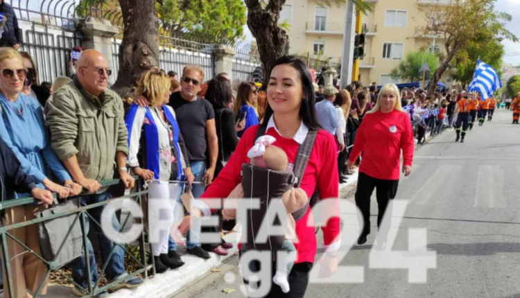 Τρεις νεαρές γυναίκες στα Χανιά παρέλασαν, για την 28η Οκτωβρίου, έχοντας τα μωρά στην αγκαλιά τους.