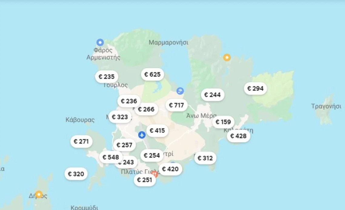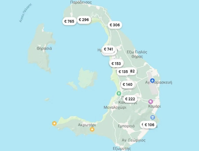 Ειδικότερα, σύμφωνα με τα αποτελέσματα στις πλατφόρμες του Booking, αλλά και του Airbnb, φαίνεται πως δεν υπάρχει ούτε… τρύπα με τιμή μικρότερη των 100 ευρώ τη βραδιά σε δημοφιλή νησιά, όπως η Μήλος, η Σίφνος, η Φολέγανδρος, η Μύκονος ή η Σαντορίνη.