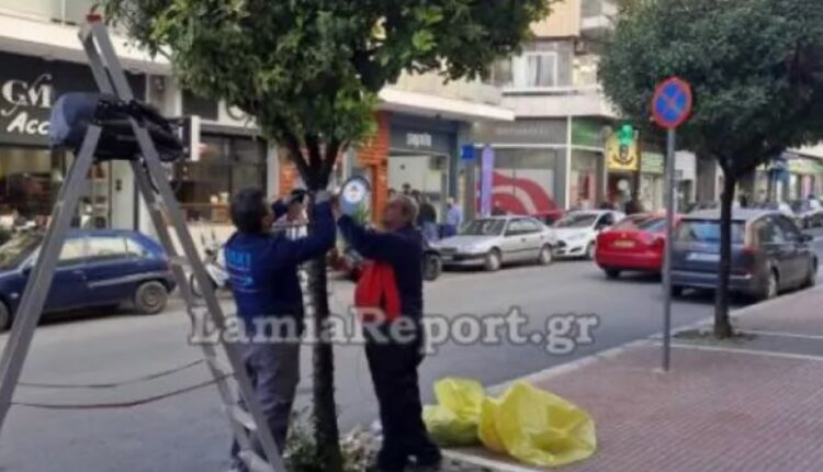 Μια δυσάρεστη έκπληξη περίμενε τους υπαλλήλους ηλεκτροφωτισμού του Δήμου Λαμιέων, την ώρα που στόλιζαν τα δέντρα της οδού Καποδιστρίου στο κέντρο της πόλης.