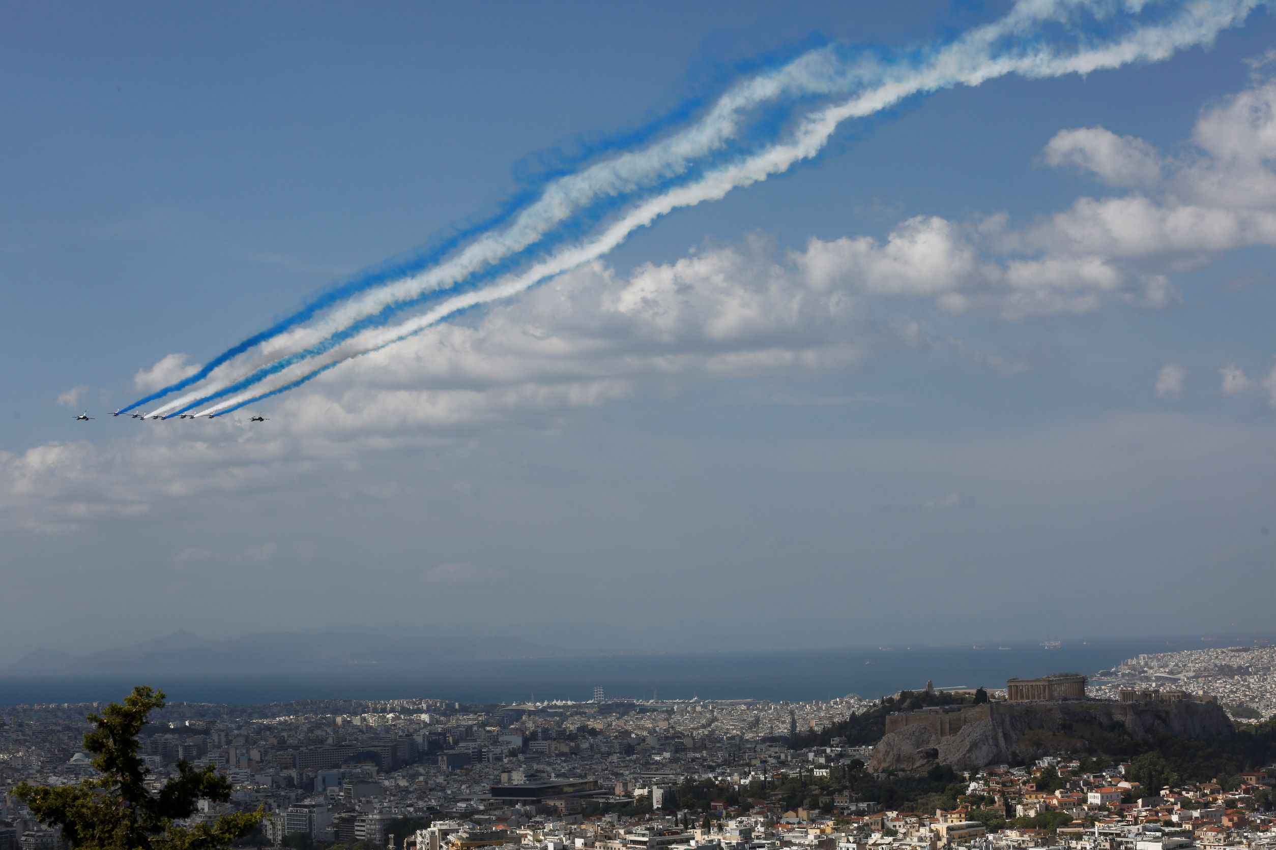 Την ελληνική σημαία πάνω από την ακρόπολη σχημάτισαν μαχητικά αεροπλάνα Rafale.