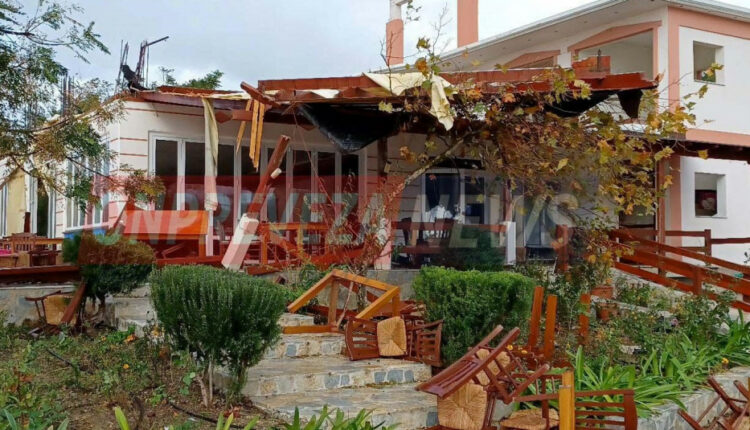 Η εν λόγω ταβέρνα στην Πρέβεζα διαλύθηκε, χωρίς ευτυχώς να υπάρξουν τραυματίες. Όχι μόνο ξηλώθηκε η σκεπή και βρέθηκε 200 μέτρα μακριά μέσα στη δασική περιοχή που περιβάλλει το κατάστημα αλλά καταστράφηκαν και οι ξύλινες κατασκευές, με δοκάρια να σπάνε στη μέση.