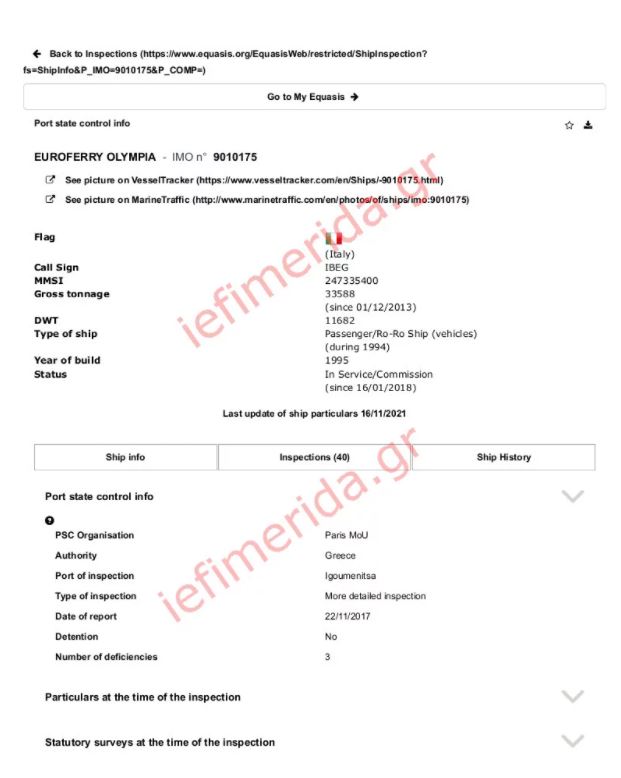 Σύμφωνα με πληροφορίες του iefimerida.gr, πολλά είναι τα προβλήματα στο επίπεδο της ασφάλειας, της επικοινωνίας αλλά και της πυρασφάλειας που παρατηρούνται στις εκθέσεις ελέγχους που έχουν γίνει στο πλοίο Euroferry Olympia από το 2014 έως και σήμερα.
