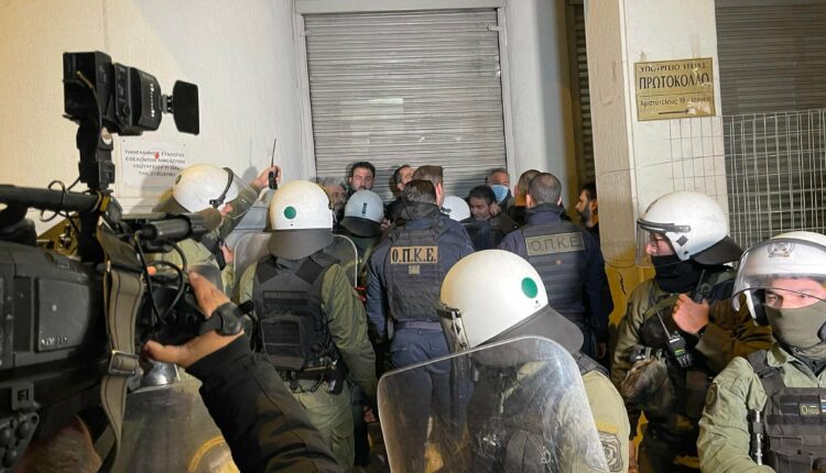 Ειδικότερα, μονάδες των ΜΑΤ, ΟΠΚΕ και Υ.ΜΕ.Τ είχαν μπει μπροστά στους απεργούς στην είσοδο του υπουργείου.