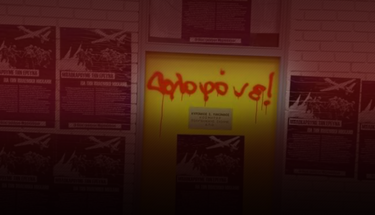 Πιο συγκεκριμένα, ο “Σύλλογος Φοιτητών Ηλεκτρολόγων Μηχανολόγων” του ΑΠΘ έγραψε με κόκκινη μπογιά στην πόρτα του Κοσμήτορα της σχολής τη λέξη “Δολοφόνε”, γιατί “αντιδρούν” στην έρευνα που γίνεται στη σχολή για την κατασκευή drone σε συνεργασία με την ΕΑΒ, το Δημοκρίτειο Πανεπιστήμιο Θράκης και το Πανεπιστήμιο Θεσσαλίας.
