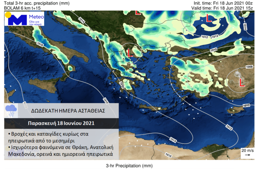Στο χάρτη που ακολουθεί παρουσιάζεται ενδεικτικά ο υετός που αναμένεται κατά το τρίωρο 15:00 – 18:00 της Παρασκευής.
