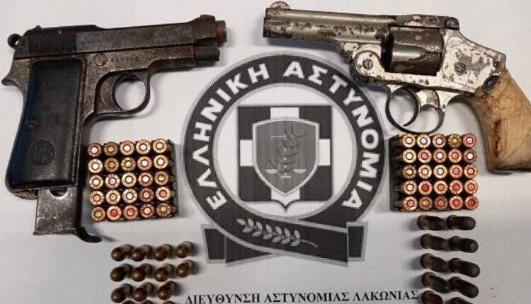 Κατά την έρευνα που έγινε στην κατοικία της 52χρονης Ελληνίδας, το πρωί της Παρασκευής, βρέθηκαν ένα πιστόλι, ένα περίστροφο και 76 φυσίγγια διαφόρων διαμετρημάτων τα οποία κατασχέθηκαν. Τα όπλα εστάλησαν στα εγκληματολογικά εργαστήρια για βαλλιστική εξέταση και η 52χρονη οδηγήθηκε στον εισαγγελέα Πρωτοδικών Γυθείου, που της απήγγειλε κατηγορία για παράνομη οπλοκατοχή.