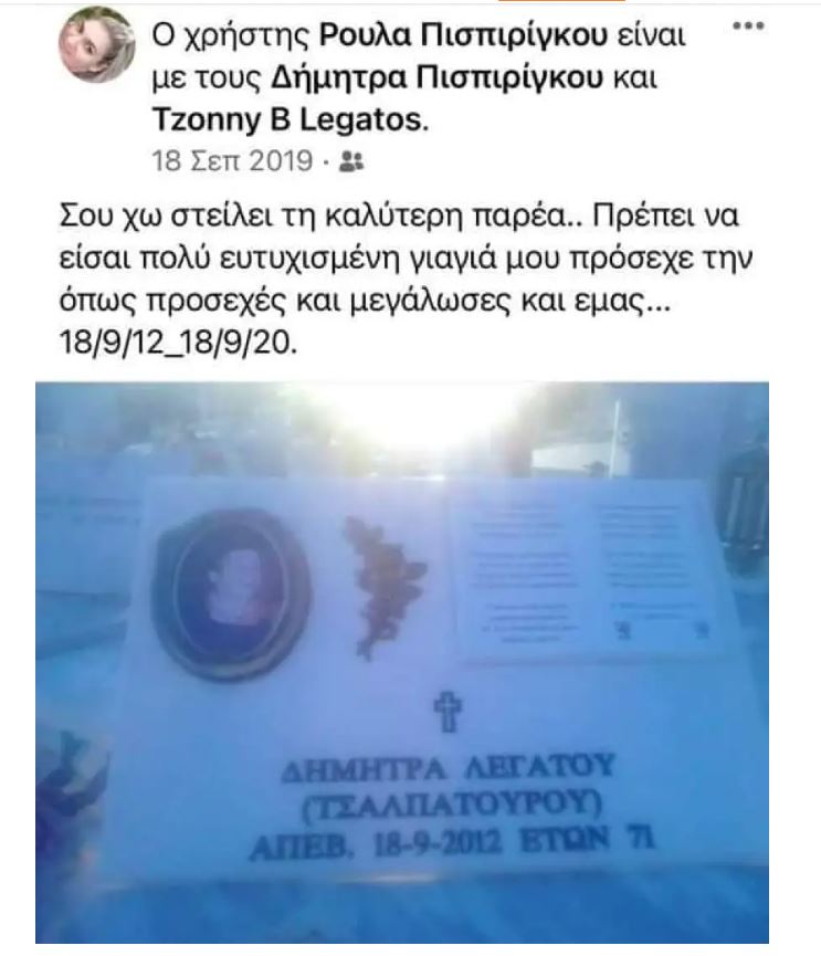 Στο φως της δημοσιότητας έρχεται μία ανάρτηση της Ρούλας Πισπιρίγκου μετά τον θάνατο της κόρης της Μαλένας. Στη συγκεκριμένη ανάρτηση η 33χρονη δημοσιεύει μια φωτογραφία από το μνήμα της γιαγιάς της και τη συνοδεύει με το εξής κείμενο: «Σου έχω στείλει την καλύτερη παρέα… Πρέπει να είσαι πολύ ευτυχισμένη γιαγιά μου πρόσεχέ την όπως πρόσεχες και μεγάλωσες και εμάς…»