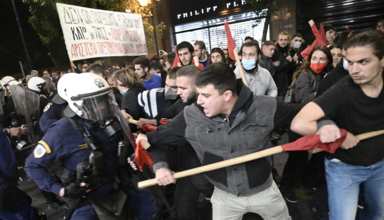 Οι δυνάμεις των ΜΑΤ απάντησαν με δακρυγόνα και χειροβομβίδες κρότου – λάμψης, ενώ επιστρατεύτηκε και «Αύρα» της ΕΛ.ΑΣ.
