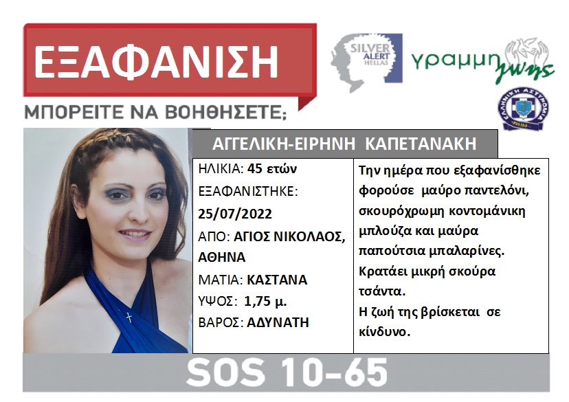 Η Αγγελική – Ειρήνη Καπετανάκη, 45 ετών, εξαφανίστηκε από το σπίτι της, στην περιοχή του Αγίου Νικολάου, στην Αθήνα, το πρωί της 25/07/2022, όταν έφυγε για να πάει στη δουλειά της και δεν επέστρεψε. Έκτοτε, δεν έχει δώσει σημεία ζωής. Έχει καστανά μάτια, ύψος 1,75μ και είναι αδύνατη.