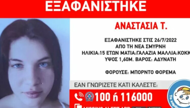 Συναγερμός έχει σημάνει για την εξαφάνιση από δομή παιδικής προστασίας στη Νέα Σμύρνη της 15χρονης Αναστασίας Τ. Το κορίτσι αγνοείται από τις 26 Ιουλίου στις 21:30. «Το Χαμόγελο του Παιδιού» ενημερώθηκε σήμερα, 31 Ιουλίου, και προχώρησε στη δημοσιοποίηση των στοιχείων της ανήλικης κατόπιν εισαγγελικής εντολής καθώς συντρέχουν λόγοι που θέτουν τη ζωή της σε κίνδυνο.