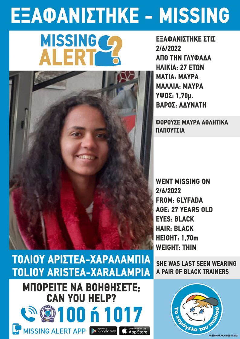 Συναγερμός σήμανε στο «Χαμόγελο του Παιδιού» και στην αστυνομία μετά τη σημερινή εξαφάνιση από την περιοχή της Γλυφάδας της Αριστέας – Χαραλαμπίας Τόλιου, 27 ετών.