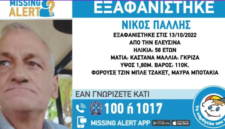 Στις 13/10/22, εξαφανίστηκε από την περιοχή της Ελευσίνας, ο Νίκος Πάλλης, 58 ετών.