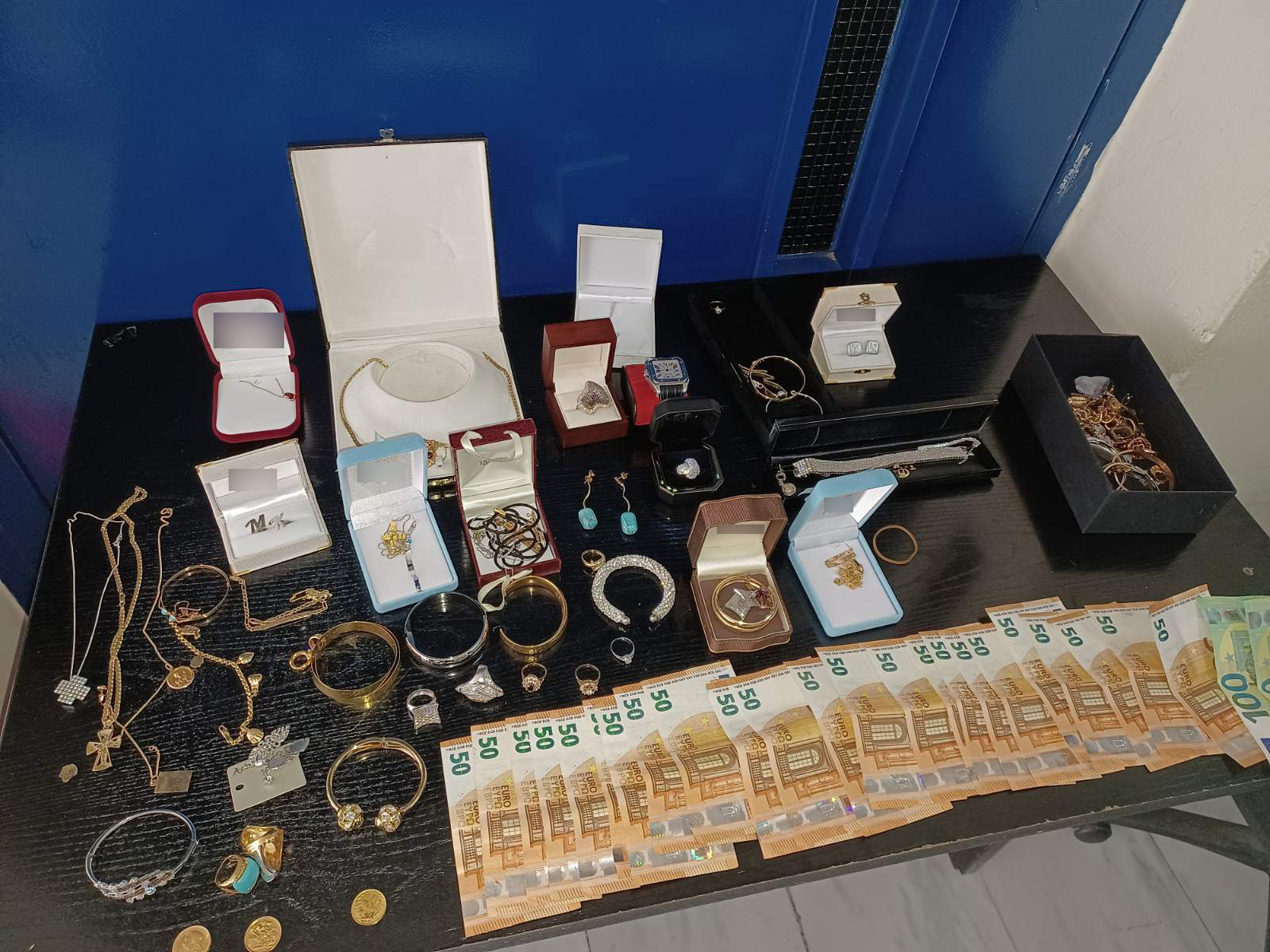 Μετά από έρευνα στην οικία του στην περιοχή των Καμινίων, βρέθηκαν συνολικά και κατασχέθηκαν πλήθος κοσμημάτων και τιμαλφή, για τα οποία δεν μπορούσε να δικαιολογήσει την κατοχή τους και το χρηματικό ποσό των 1.500 ευρώ.