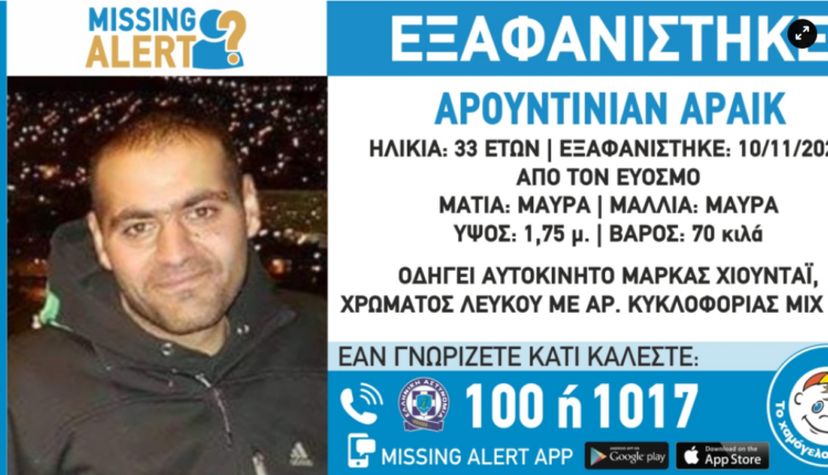 Εξαφανίστηκε την περασμένη Πέμπτη 10 Νοεμβρίου από την περιοχή του Ευόσμου Θεσσαλονίκης, ο Αράικ Αρουτινιάν, 33 ετών. Το «Χαμόγελο του Παιδιού» ενημερώθηκε για την εξαφάνιση του Αράικ Αρουτινιάν σήμερα Τρίτη 15 Νοεμβρίου και προχώρησε στη δημοσιοποίηση των στοιχείων του ενήλικου κατόπιν αιτήματος της οικογένειας του, καθώς ενδέχεται να συντρέχουν λόγοι οι οποίοι θέτουν τη ζωή του σε κίνδυνο.