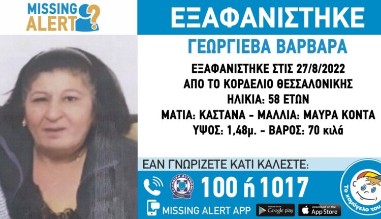 Την εξαφάνιση 58χρονης από το Κορδελιό Θεσσαλονίκης το περασμένο Σάββατο 27.8.2022, βραδινές ώρες γνωστοποιεί με ανακοίνωσή του, το “Χαμόγελο του Παιδιού”.