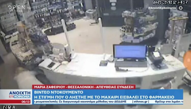 Η ληστεία καταγράφεται από τις κάμερες ασφαλείας του φαρμακείου στη Θεσσαλονίκη. Ο δράστης μπαίνει με κουκούλα και κρατάει μαχαίρι.