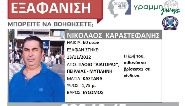 Πρόκειται για τον Νικόλα Καραστεφανή, ο οποίος τελευταία φορά, εθεάθη επιβαίνων στο πλοίο ΔΙΑΓΟΡΑΣ, στο δρομολόγιο Πειραιάς – Μυτιλήνη, στις 13/11/22.