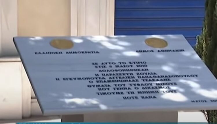 Τη μαρμάρινη πλακέτα η οποία είναι αφιερωμένη στα θύματα της τραγωδίας της Marfin στην οδό Σταδίου, έσπασαν άγνωστοι την Τρίτη.
