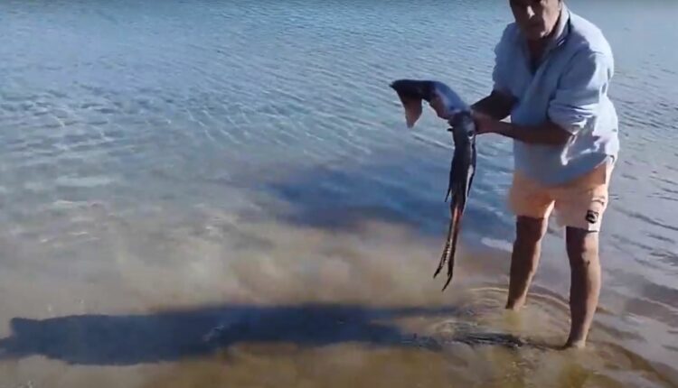 Εδώ το κρατάει ο φίλος Βασίλης από τους “Χειμερινους”. Να σας πω ότι και πέρυσι στην ίδια παραλία είχε βγει “μισοζωντανο” παρόμοιο θράψαλο. Ενώ πριν 5-6 χρόνια εγώ στην διπλανή παραλία των “Απτερων” είχα βρει να έχει βγει νεκρό στην παραλία ένα όμοιο ίδιου μεγέθους…»