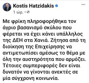 Για αυτή την ειδεχθή πράξη θέση πήρε ο κ. Χατζηδάκης γράφοντας: «Με φρίκη πληροφορήθηκα τον άγριο βασανισμό σκύλου που φέρεται να έχει κάνει υπάλληλος της ΔΕΗ στα Χανιά. Ζήτησα από τη διοίκηση της Επιχείρησης να αντιμετωπίσει αμέσως το θέμα με όλη την αυστηρότητα που αρμόζει. Τέτοιες συμπεριφορές δεν είναι δυνατόν να γίνονται ανεκτές σε μία σύγχρονη κοινωνία».