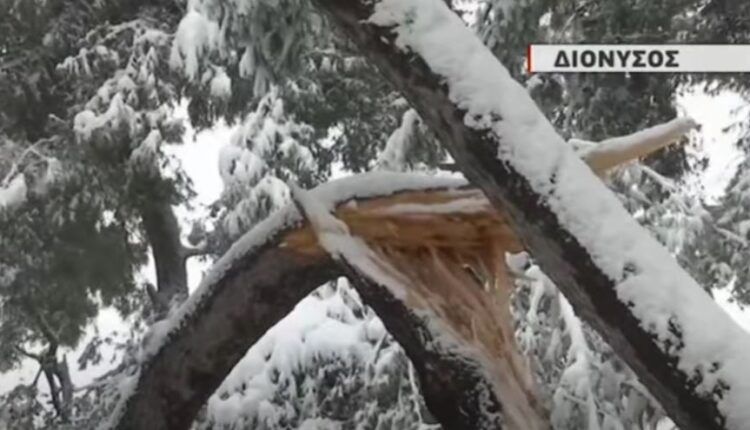 Και στο κέντρο παρουσιάστηκε ανάλογο περιστατικό πτώσης δέντρου. Συγκεκριμένα, από το βάρος του χιονιού ένα δέντρο έπεσε στην μέση του δρόμου στην οδό Ευελπίδων στην Κυψέλη.