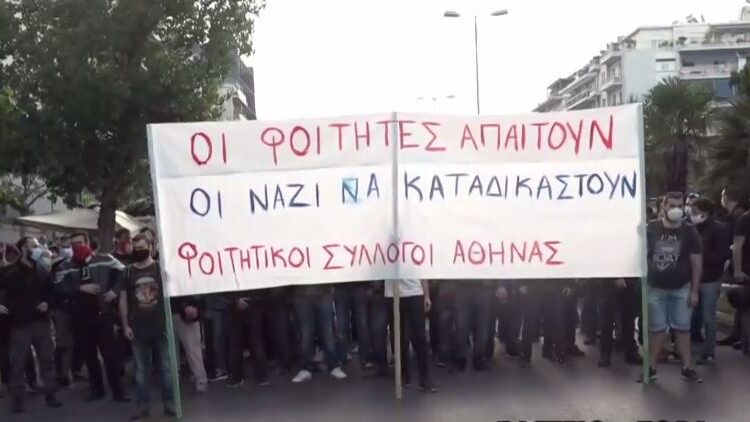 Στην «κεφαλή» της πορείας βρίσκεται πανό του ΠΑΜΕ, με το σύνθημα «Ο λαός απαιτεί οι ναζί στη φυλακή».