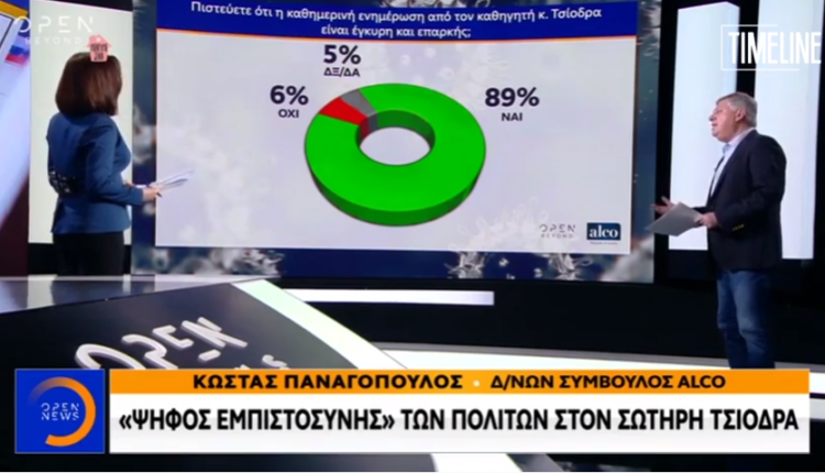 Η δημοσκόπηση της Alco για το κεντρικό δελτίων ειδήσεων του Open έδειξε πως το 89% των ερωτηθέντων πιστεύουν πως η πληροφόρηση από τον Σωτήρη Τσιόδρα είναι έγκυρη και επαρκής, ενώ μόλις το 6% απάντησε αρνητικά.