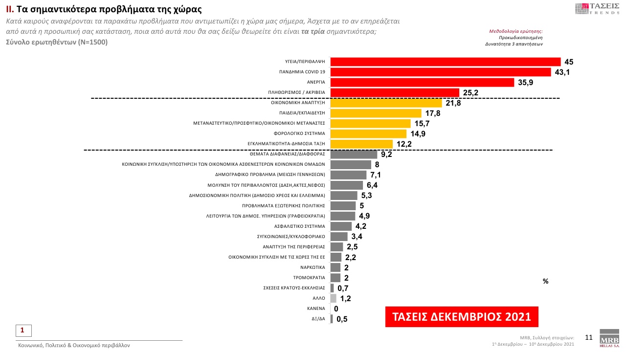Οι πολίτες θεωρούν ότι τα 4 σημαντικότερα προβλήματα της χώρας είναι: υγεία/ περίθαλψη με 45 %, πανδημία Covid 19 με 43,1 %, ανεργία με 35,9 %, πληθωρισμός/ακρίβεια με 25,2 %.